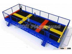 "A.Steel Rust-proofing treated Galvanized,then Akzo powder coated. 4cmx8cm,8x8cm, thickness is 2.5 mm. B. Jumping bed US imported and extended protective isolation designed,double layers. http://www.maxtrampoline.com/"